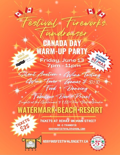 75th Annual Cherry Fiesta Fireworks Fundraiser. Come out and enjoy yourself and support this Fireworks Fundraiser! Dancing with Diane Ball, food, wine tasting, 50/50, silent auction, and a fantastic door prize – 2 nights stay at Watermark, plus a $100 GC to 15 Park Bistro.