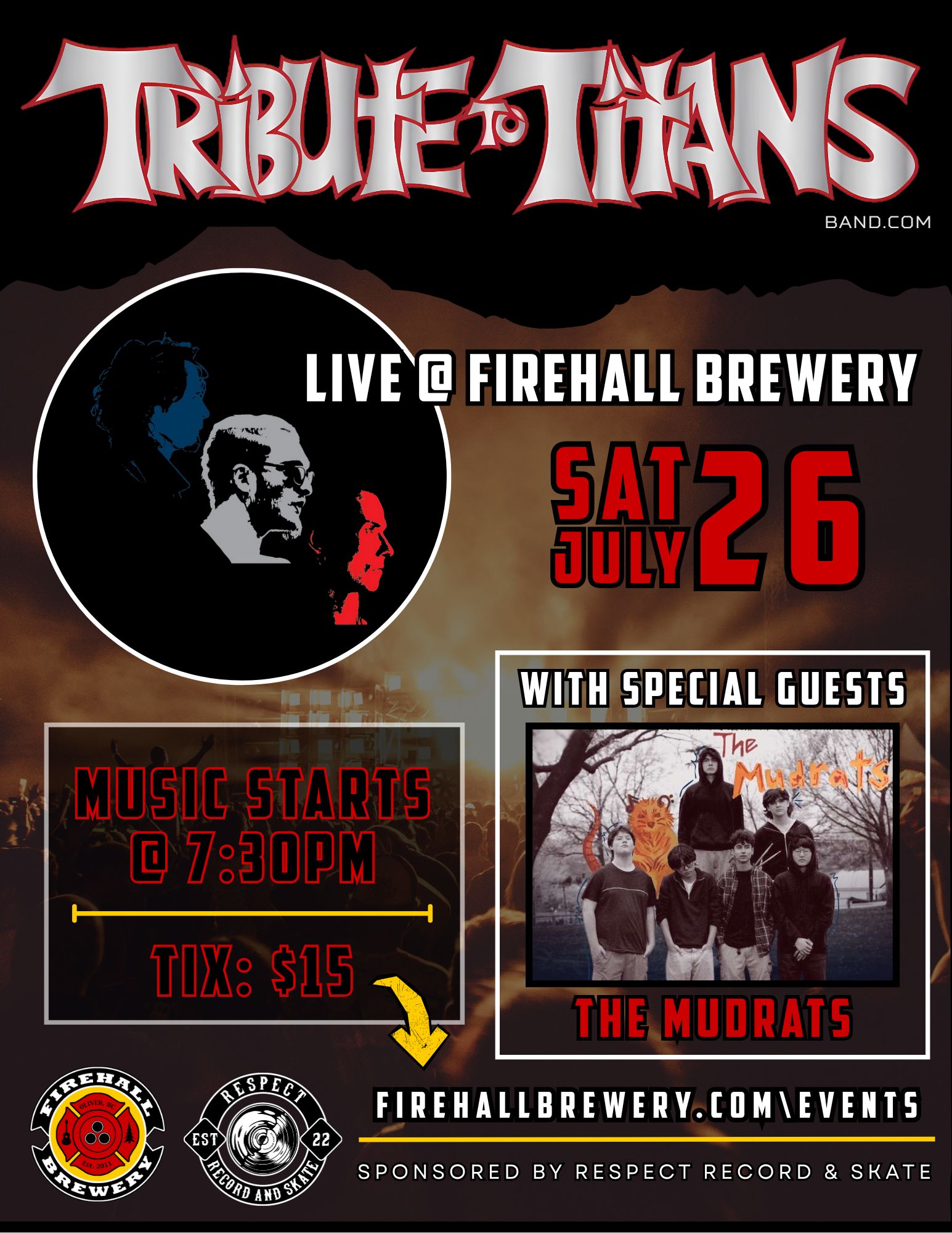 A night of local talent sponsored by Respect Record and Skate & The Firehall Brewery – Tribute to Titans and The Mudrats will be playing at the Firehall brewery.