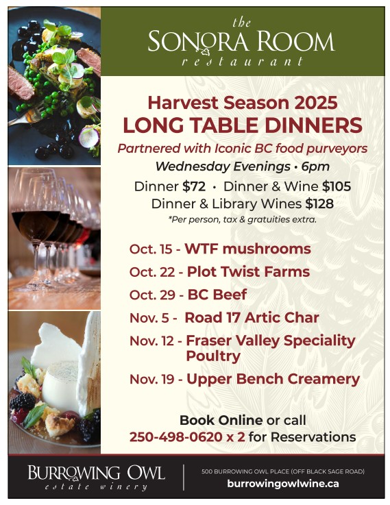 Join us for our Harvest Season Long Table Dinners! For each dinner, we have partnered with an iconic BC food purveyor to showcase the unique flavours of British Columbia, all expertly paired with wines from Burrowing Owl.