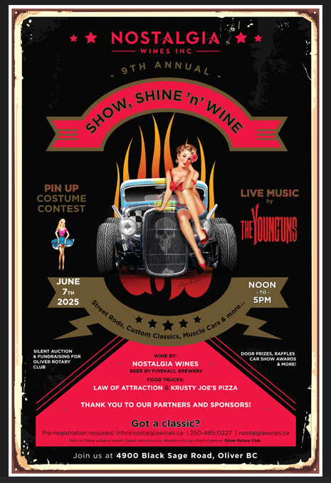 Rev up your engines and join us Saturday, June 7, 2025 from noon to 500pm for a fun day of street rods, custom classics, muscle cars and more! It is time to Show, Shine ‘n’ Wine at Nostalgia Wines.