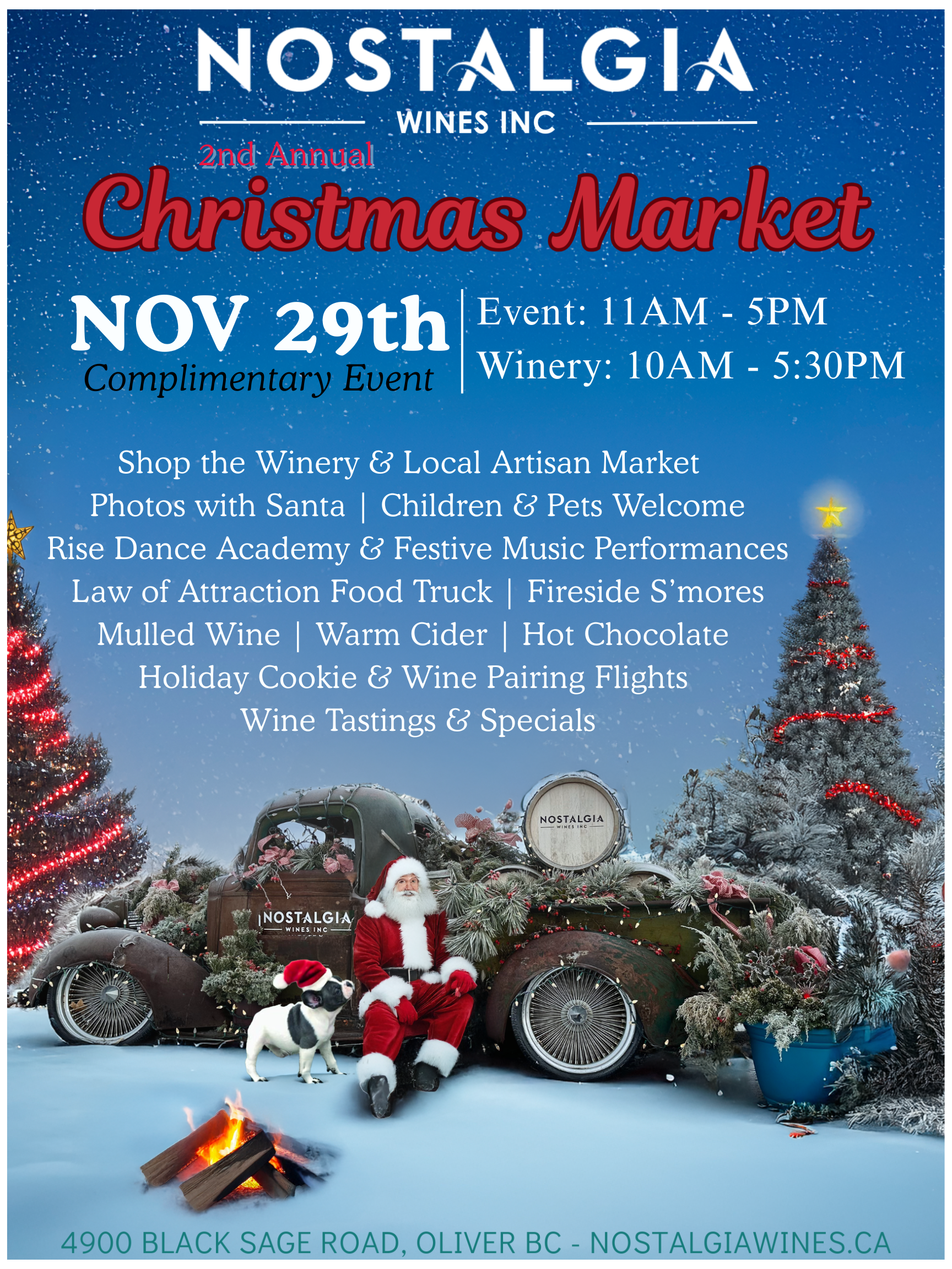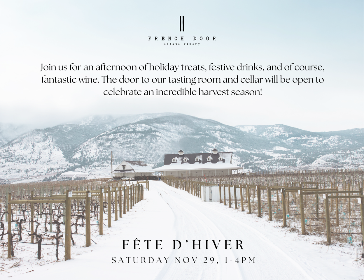 Celebrate the arrival of winter with a festive marketplace full of local vendors, delicious eats, and exclusive wine experiences — all set within the stunning scenery of our vineyard and outdoor spaces.