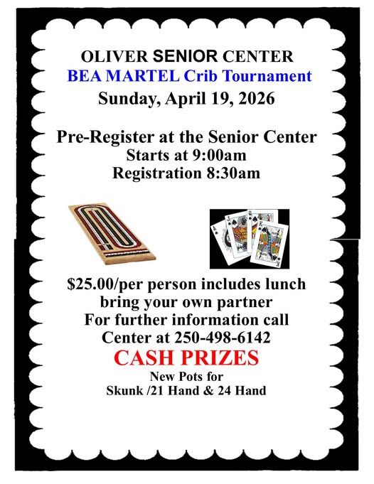 Oliver Senior Centre 5876 Airport Street British Columbia Oliver V0H 1T0 Canada, Oliver, British Columbia, CanadaCheck out the calendar for all of the events happening in April at the Oliver Senior Centre!