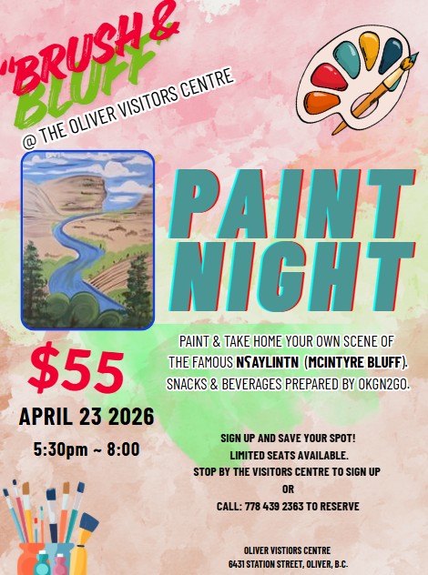 Oliver Visitor Centre 6431 Station Street British Columbia Oliver V0H 1T0 Canada, Oliver, British Columbia, CanadaGet ready for a creative night out in the Wine Capital of Canada! Join us at the Oliver Visitor Centre on April 23 for an unforgettable Paint Night where you’ll create your own take-home masterpiece of the iconic Nʕaylintn (McIntyre Bluff).